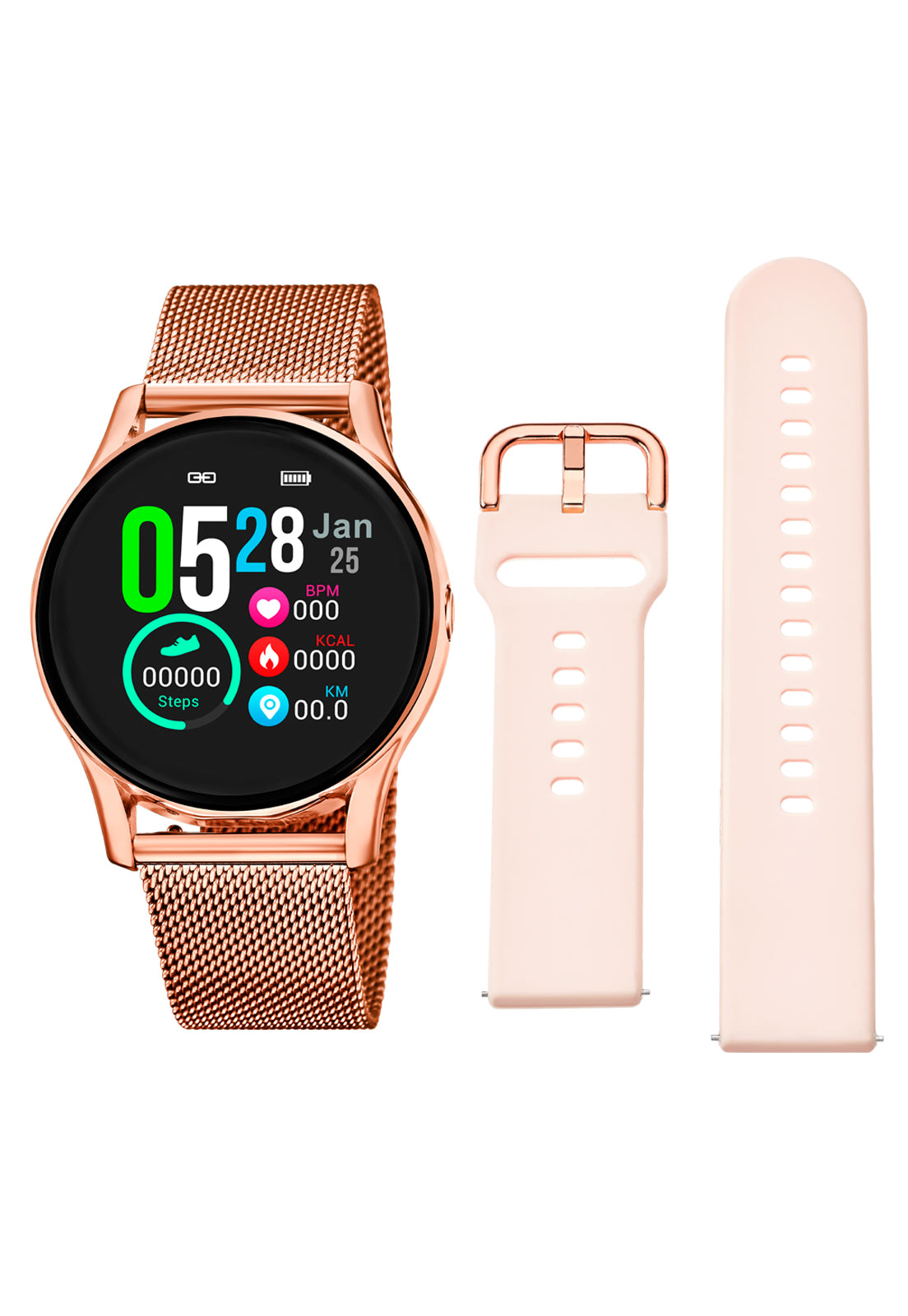 Smartwatch para Mujer con correa de acero intercambiable. Este Reloj incluye una correa de Silicona adicional.