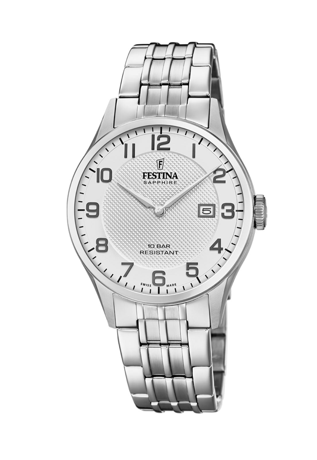 • Género: HombreMarca: Festina SwissColección: Swiss MadeFunción: QuartzPulsera: AceroColor Pulsera: PlateadoDiámetro de Caja: 40.00mmAncho de Pulsera: 19.95mmResistencia al Agua: 10 ATMCalendario: SiTipo de Cristal: ZafiroGarantía: 2 Años de Garantía por Defecto de Fabricación