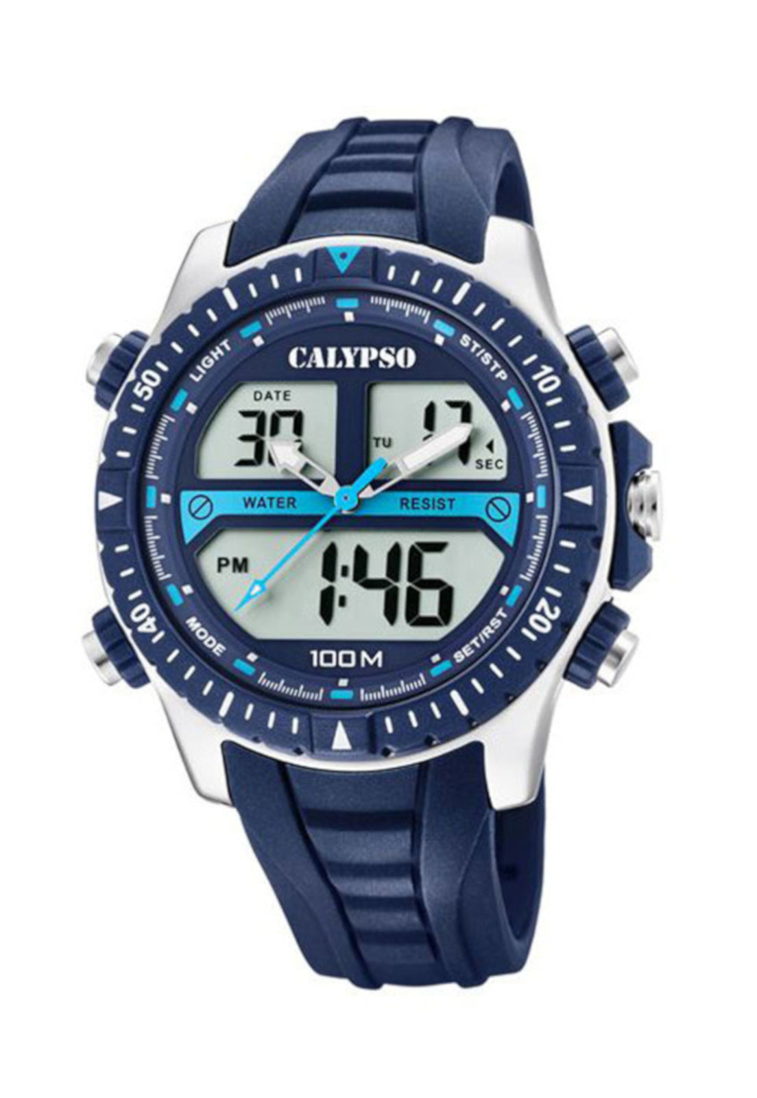 Reloj Hombre K5773/2 Calypso Street Style, Este reloj marca Calypso tiene una caja de plástico cuenta con una correa de Resina. Dentro de la caja se encuentra un mecanismo de alta calidad el cual esta protegido por un cristal Plexi, este reloj es resistente al agua hasta 10 ATM y tienen como objetivo cautivar con su look fresco y extrovertido, con colores intensos y atrevidos.